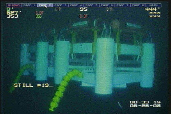 The two RetroBuoys™ are designed to be deployed on the seabed 150 to 400 feet outboard of the base of the jacket; the double-armored power cables connect each RetroBuoy™ to a topside marine transformer-rectifier rated at 450 Amps. The cable is routed to the surface through a spare J-tube.