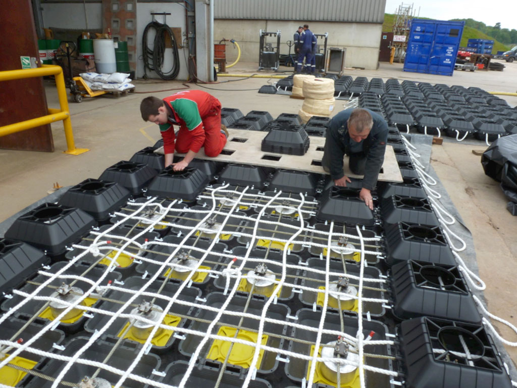 Deepwater’s Retromats™, which are concrete stabilization mattresses with anode arrays cast inside, were used as the CP source. They were delivered as empty shells and anodes, and were assembled on-site by local crews. The shells were snapped together, the cables were connected and concrete was poured to embed the anodes within the mat.