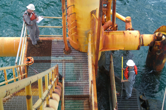 Drop cell (dip cell) corrosion probe for over-the-side cathodic protection survey of platforms, docks and floating production assets.