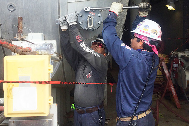 All anodes were cleaned and visually inspected. One anode had separated from the flange in one of the float cells, so Deepwater replaced the anode and seal in the existing flange assembly. A cable tray was temporarily moved to ensure proper installation of the repaired anode, and isolation checks verified the reference cells and anodes were not contacting the tank structure. The work was performed during a routine tank cleanout to minimize downtime.